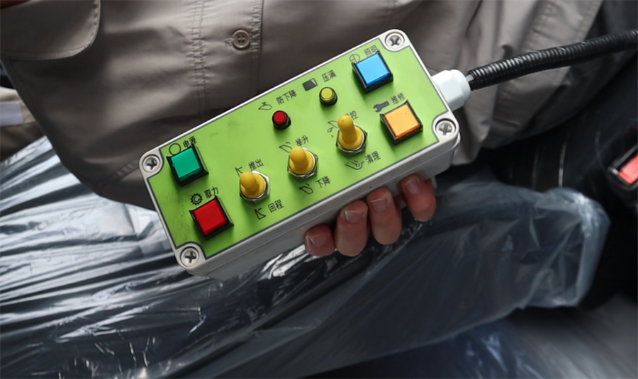 車輛兩側(cè)均設(shè)置緊急按鈕,配備高強(qiáng)度安全撐桿和防下降、推板感應(yīng)裝置,再次強(qiáng)化了誤操作的概念,在駕駛室也可遙控操作,安全便捷兩手抓!
